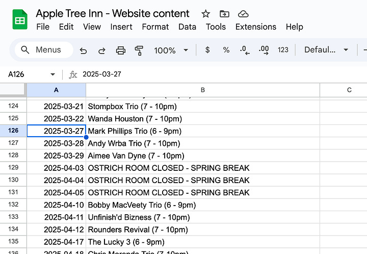 For a long time I made most of those updates manually. I added a Google Sheet for music listings. I had Sean uploading the menus to a Google Drive folder.