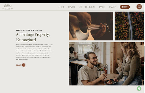 Many of the photographs were stock. Some of them, though not taken here, at least spoke to the “ecstatic truth” of the property: a winding country road through autumn foliage; a guitar leaning against its stand. But others were not at all representative of the real place. A beautiful woman reading in a hammock, which we don’t have; a hipster couple in a modern farmhouse-style kitchen, which is not our architectural style or a space we offer to guests, passing bacon, which we don’t serve.1