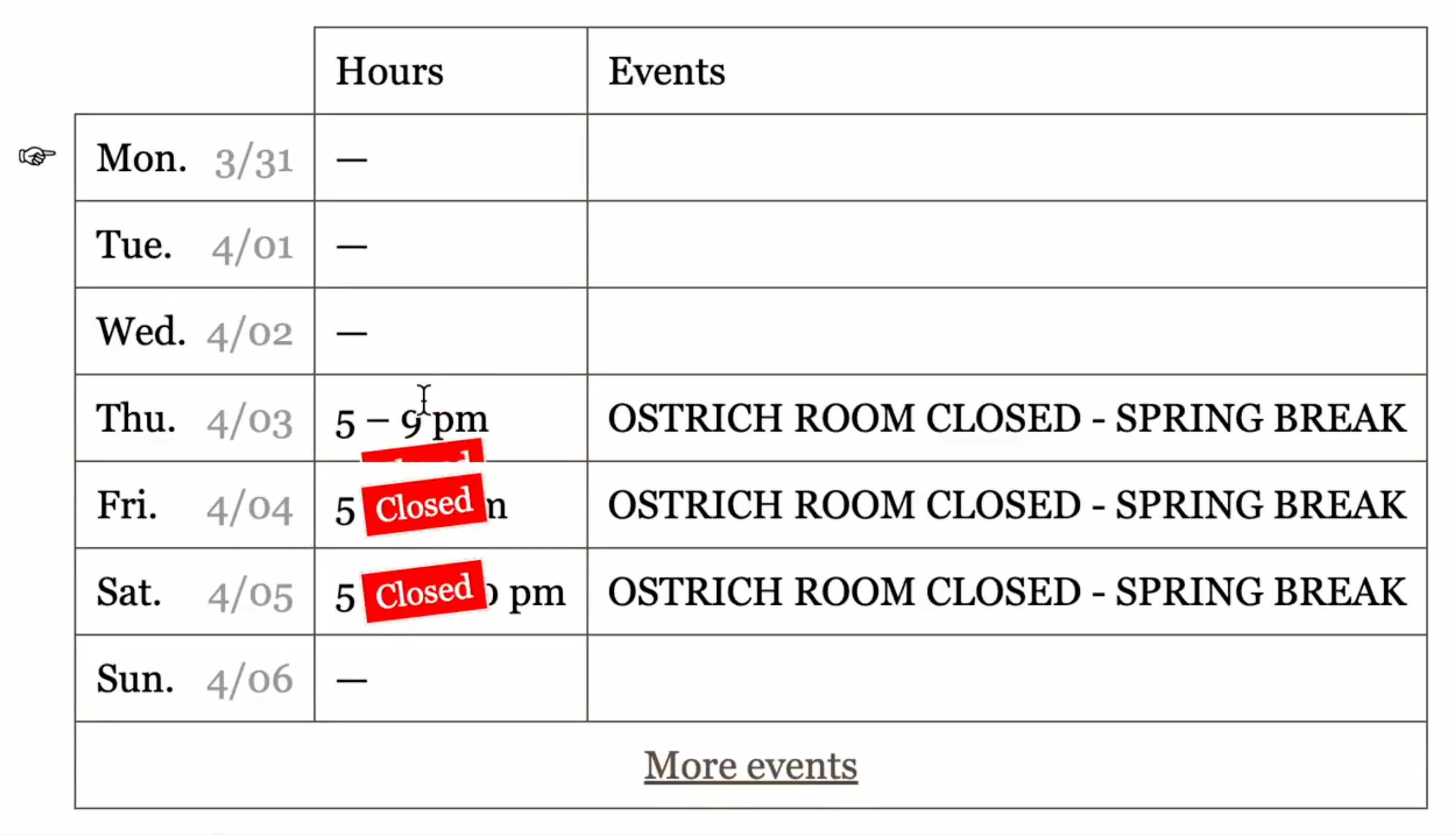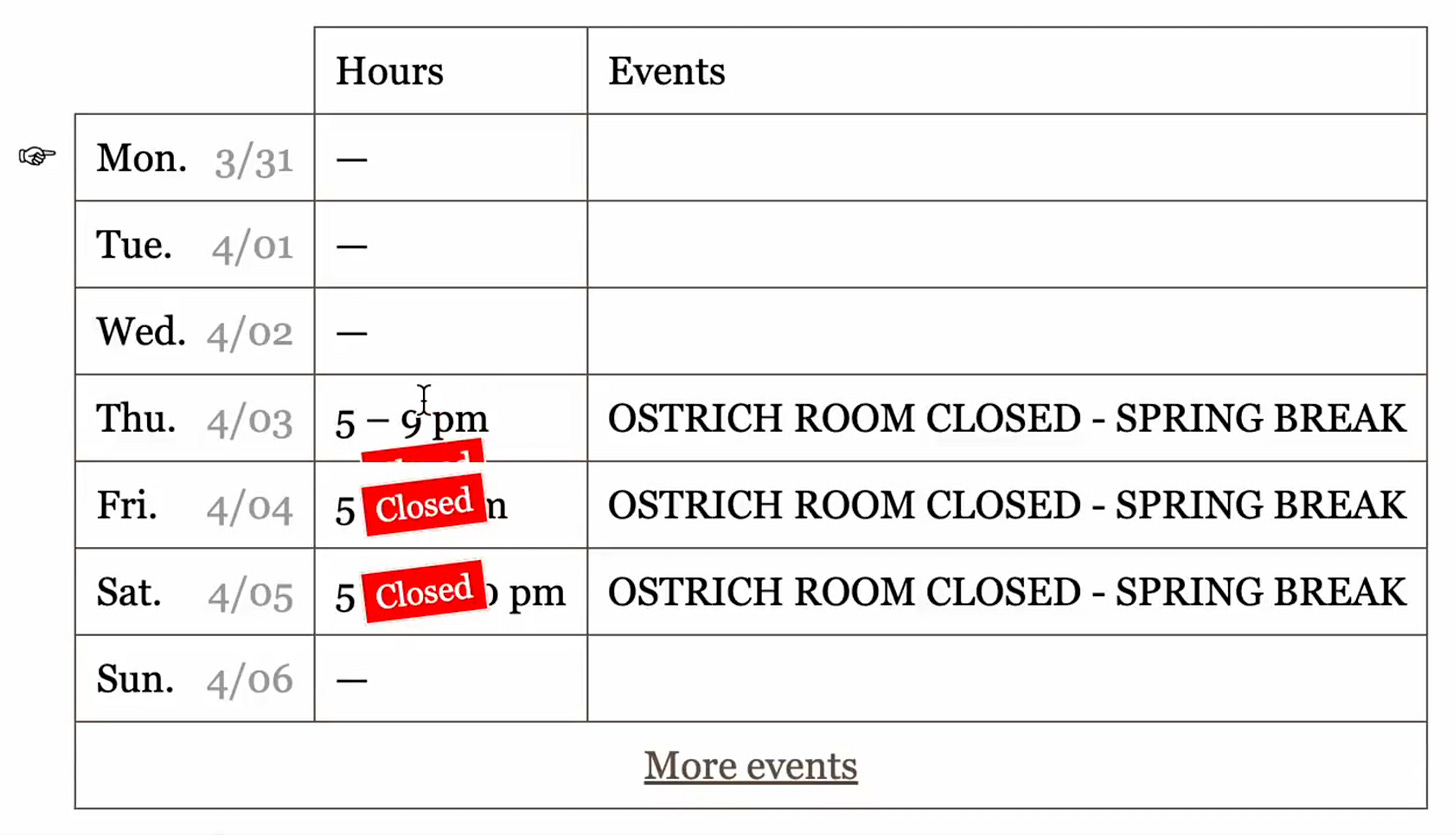 But then the operation grew. Christian wanted to fix the size of a bed in a room. Abby wanted to update the private event inquiry form. The Ostrich Room got up and running, and live music restarted, and more and more of the effort went to F&B — which I learned was a much faster pace layer. Claire no longer knew everything, which meant I really didn’t.5 Sean had to update opening hours every month or two, and the menus every week or two. And Jenny had to maintain the live music listings, which sometimes had urgent updates from day to day. And then Hagai and Adi opened Báladi here, with its own hours and menus. Everyone wanted to put announcement banners at the top. And they all had to go through me!