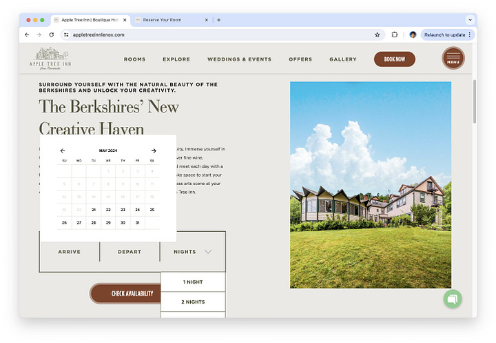 At the time, it felt like this had taken forever; but, in retrospect, it was “just” two months after Claire took over. (Just in time for our first summer season.) For many friends who heard what Claire was doing and Googled it, this version was their first impression. I remember a couple of them saying things like, “Congratulations, the hotel looks beautiful! And I’m sure you can’t wait to redesign that insane ancient ’90s Web site.”3 And I thought, a-ha! Success! It’s a triumph!