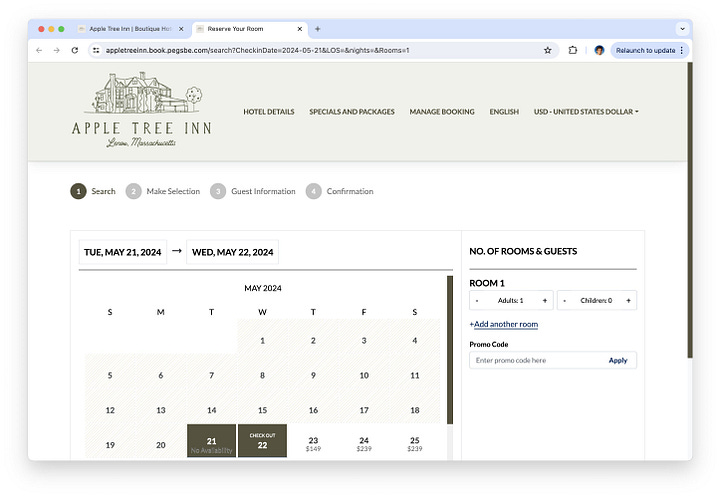 Around May, I started to understand that we really had two sites. When you went to appletreeinnlenox.com you landed on the WordPress marketing site. Nothing you did on that site had any effect on the world outside the screen. It didn’t really do anything; it only said things. The booking buttons and forms were simply hyperlinks to a totally separate booking engine, which handled all the actual e-commerce, all the credit cards and room availability and email notifications. That one does affect the world outside the screen: it means the front desk will hand you a key if you show up on the right day with the right identification.